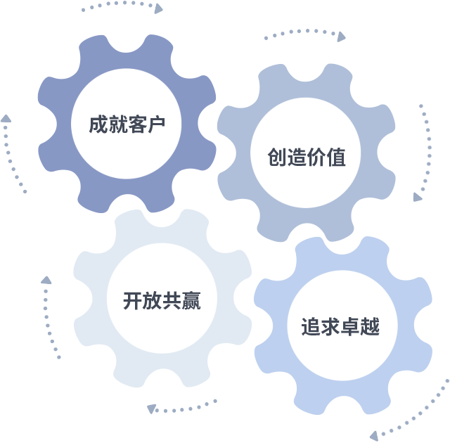 成就客户是一切决策的出发点,创造价值是衡量所有工作的标准,追求卓越是南宫ng做事做人的态度,开放共赢是南宫ng的格局也是最终的结果。价值观的齿轮环环相扣,推动着组织里的每个人不断向前。